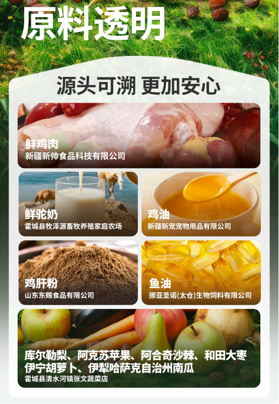 这款猫粮的大多数原料都是新疆产的,原料供应商到生产工厂(新疆新宠宠物用品有限公司)的距离非常近,可以保证食材的新鲜度。